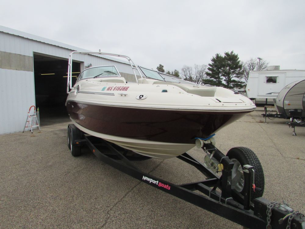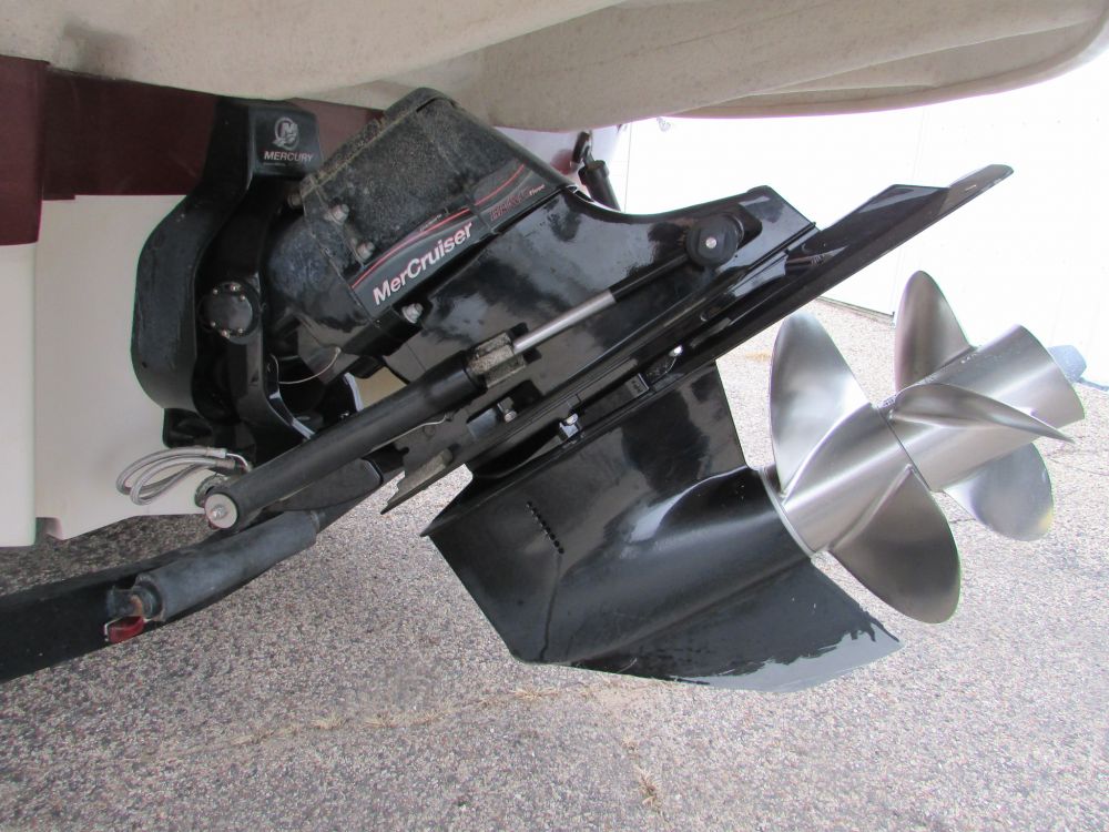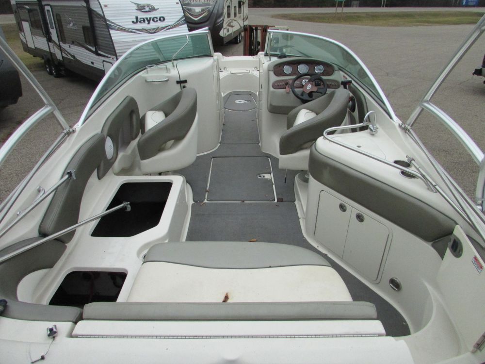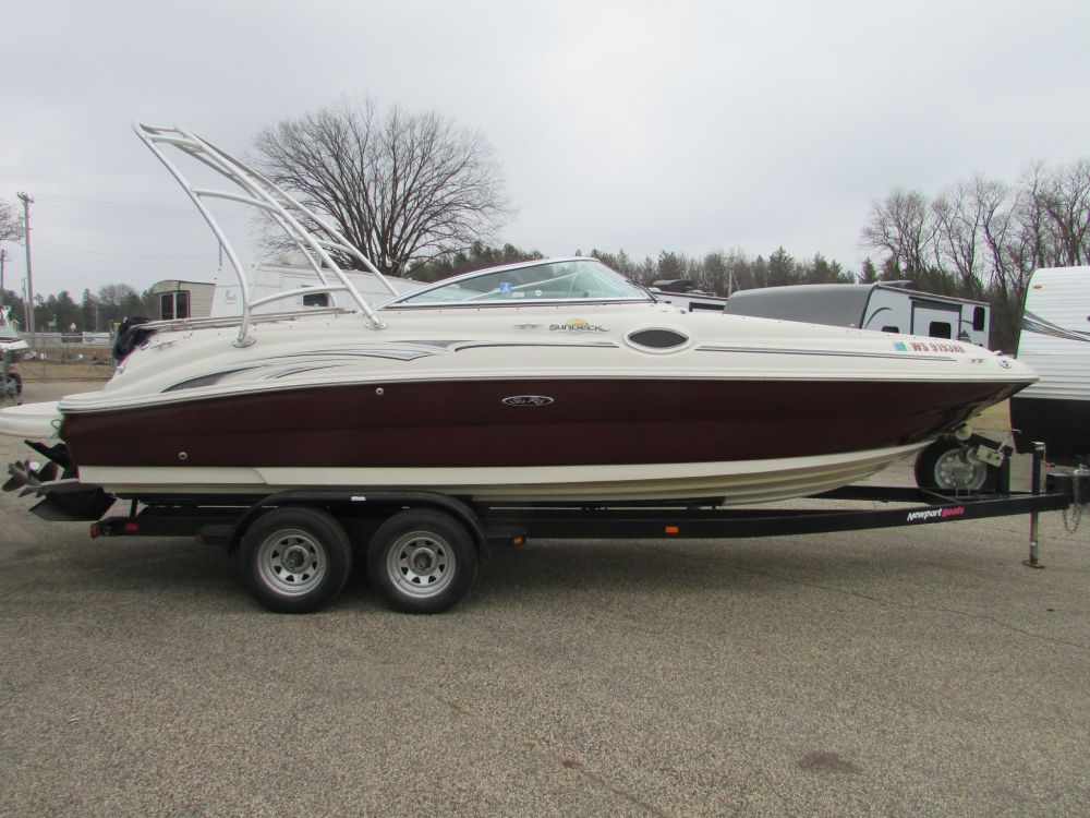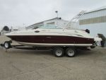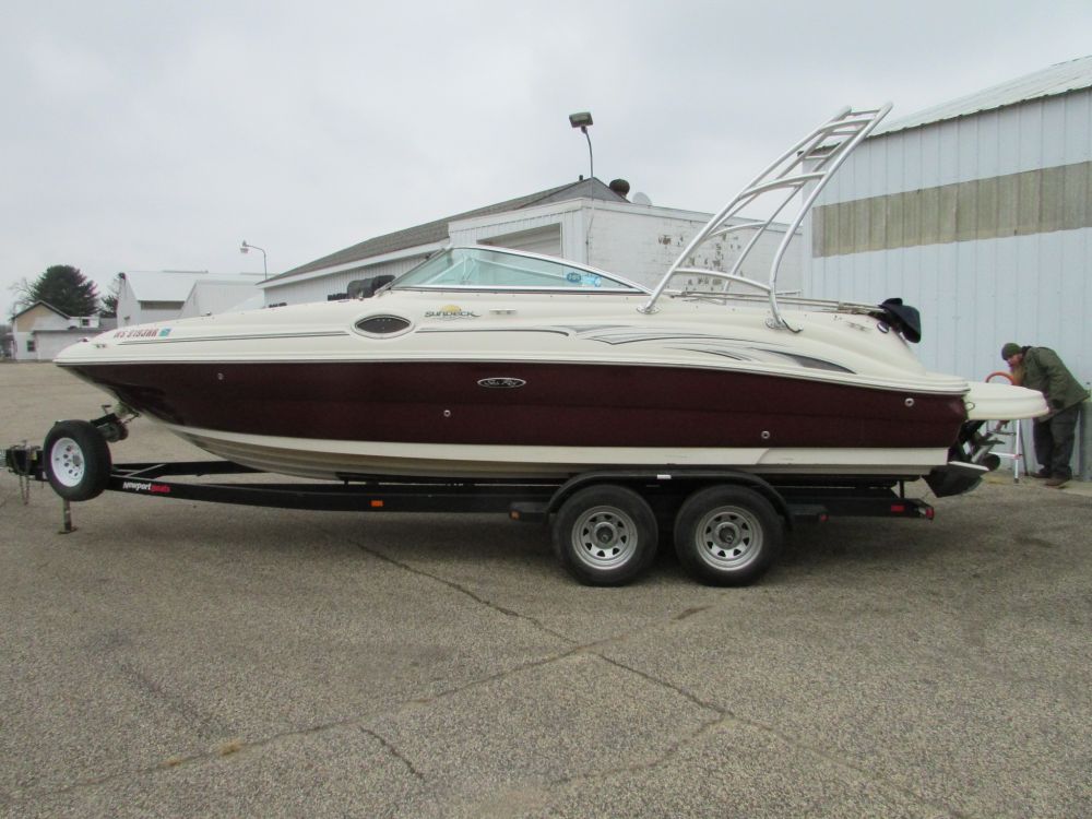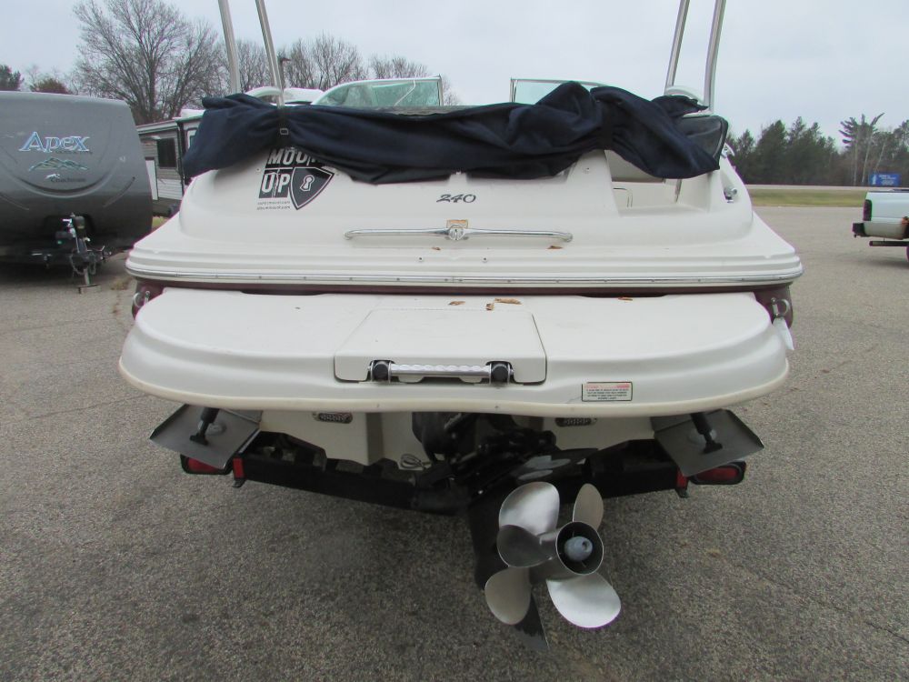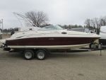 This is a 2006 Sea Ray Sundeck 240 with a MerCruiser 350 Mag MPI. The outdrive is a Duo-prop MerCruiser Bravo Three 2.00 ratio. The interior is white with gray accents, the carpet it gray. It has a sink, bathroom, radio, blue snap cover, split windshield, all cushions are there. Has ski rack, swim deck, bimini top. There asre a few scratches and chips in the gel coat. The hours on this boat are unknown at this time but will be updated at a later date.